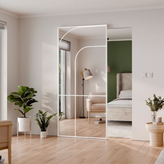 Drzwi wykonane są w aluminiowej ramie w kolorze białym, a ich wypełnienie stanowi lustro srebrne z obu stron. Lustrzana powierzchnia optycznie powiększa przestrzeń, rozświetla wnętrze i dodaje mu elegancji. Wzór łukowy namalowany pod szkłem tworzy wyjątkowy efekt dekoracyjny, który wyróżnia ten model na tle standardowych drzwi przesuwnych.