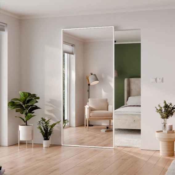 Drzwi przesuwne LUSTRO MODI 2 to eleganckie, nowoczesne i wyjątkowo efektowne drzwi wewnętrzne stworzone z myślą o stylowych wnętrzach. Biała aluminiowa rama połączona z lustrzanym wypełnieniem i dekoracyjnym wzorem pod szkłem tworzy unikatowy design, który idealnie pasuje do aranżacji glamour, modern classic, minimalistycznych i nowoczesnych.