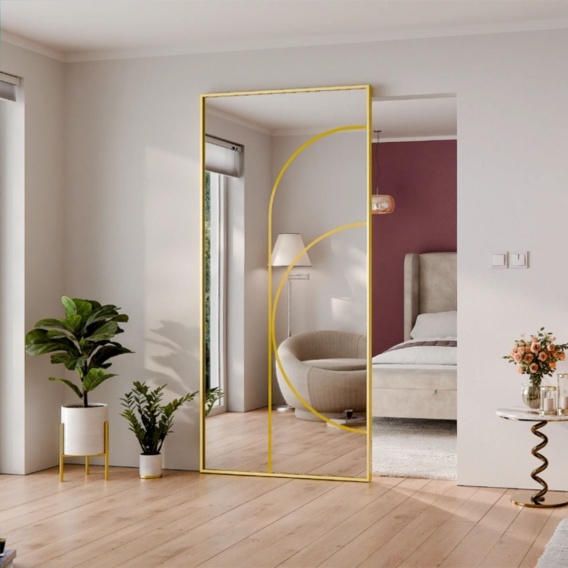 Drzwi przesuwne w aluminiowej ramie w kolorze złoty perłowy RAL 1036 to propozycja dla osób, które szukają eleganckiego, nowoczesnego i efektownego rozwiązania do wnętrz. Połączenie minimalistycznej ramy z lustrzanym wypełnieniem i dekoracyjnym wzorem pod szkłem tworzy wyjątkowy element aranżacji, który optycznie powiększa przestrzeń i dodaje jej luksusowego charakteru. Ukryty system przesuwny sprawia, że drzwi wyglądają lekko i estetycznie, a mechanizm działa cicho i płynnie.