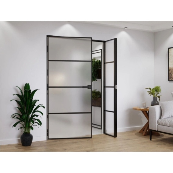 Drzwi wewnętrzne aby stworzyć pełne wdzięku przejście z jednego pomieszczenia do drugiego. Charakteru dodaje szkło hartowane typu, które przepuszcza mnóstwo światła do wnętrza. Skrzydło zawiera szybę o grubości 6 mm, wspartą na aluminiowej ramie. Prosta aluminiowa klamka o gładkiej formie podkreśla industrialny urok.