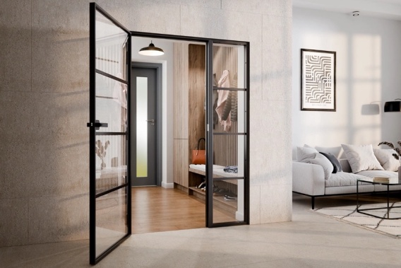 Czarne drzwi loftowe z aluminium optycznie powiększają wnętrze i nadają mu nowoczesnego charakteru.
