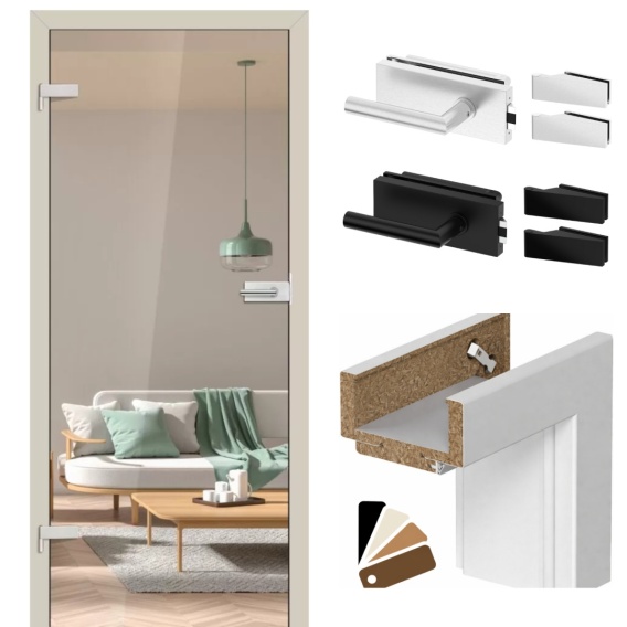 Drzwi Szklane Plato Tafla Szkło Przeźroczyste z Ościeżnicą Kolory Okucia Voster Konfiguracja
