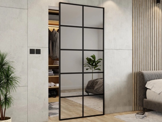 Drzwi Przesuwne w ramie aluminiowej wraz z NIEWIDOCZNYM systemem przesuwnym. Wypełnienie LUSTRO SREBRNE z czarnymi aplikacjami z dwóch stron.