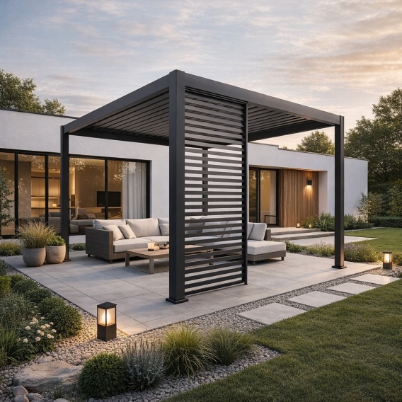 • Nowoczesne, minimalistyczne wykończenie boczne pergoli
