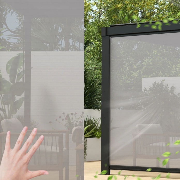 Wykonana z wysokiej jakości materiału tekstylnego, roleta skutecznie blokuje promienie UV i jest odporna na warunki atmosferyczne. Szyny prowadzące po obu stronach zapewniają stabilność i niezawodność działania, a minimalistyczny kolor antracyt doskonale komponuje się z konstrukcją pergoli.